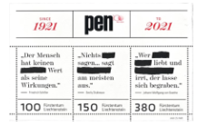 Nun sollen die Inspirationen der Liechtensteinischen Post vorgestellt werden. Zu Beginn sei an die Serien «Minnesänger» nach Originalen der Manessischen Liederhandschrift der Jahre 1961 bis 1963 und 1970 erinnert. Damals erregten diese grafisch und drucktechnisch fantastisch gestalteten Briefmarken nicht nur wegen ihres Golddruckes höchste Aufmerksamkeit (Abb. 1). Entsprechend dem zeitgemässen Know-how kommen heutzutage zahlreiche andere Techniken zum Einsatz: Ausstanzungen im Markenbild und Markenrand oder als besonderer Clou zur Verwendung als Passepartouts im Zusammenhang mit einem faltbaren Motivblock, zusätzliche Perforation im Markenbild, die Verwendung thermochromer Farbe, die z.B. bei Fingerberührung aufhellt (Abb. 2), mit Seide bezogenes Papier, Beimengungen von Steinmehl aus Sotschi (Russland) oder gemahlener Rheinkiesel, UV-Lackierung und Übergrösse im Format 180 x 382 mm bei einem Motivblock. Rubbelfelder dienten für die Emission «100 Jahre PEN International» als Zensurbalken, die Zitate sinnentstellen (Abb. 3).