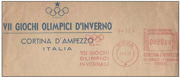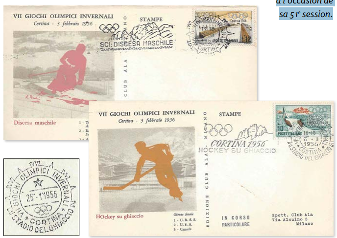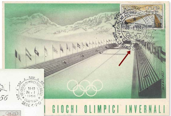 Fig. 9a|b : Le premier bureau de poste des jeux comportant un cachet manuel (SEDE CIO) et une oblitération mécanique est ouvert au public le 23 janvier 1956, à l’Hôtel Miramonti, siège du Comité international olympique,à l’occasion de sa 51e session.