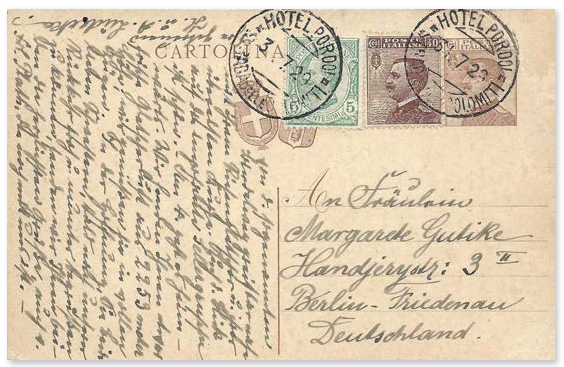 Fig. 1 : 3 juillet 1929. Cachet du bureau de poste de l’hôtel HOTEL PORDOI, STRADA DELLE DOLOMITTI, qui se trouve au Col de Pordoi.