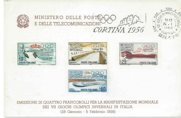 La série commémorative de quatre valeurs représente les installations les plus importantes construites à Cortina d’Ampezzo et divers chaînons montagneux dans les Dolomites (Fig. 8). Le papier qui a servi à imprimer cette série provient de deux fabricants. Ainsi, on trouve des timbre imprimés sur du papier comportant deux filigranes différents. Le premier bureau de poste des jeux est ouvert au public le 23 janvier 1956, à l’Hôtel Miramonti, siège du Comité international olympique (Fig. 9a|b).