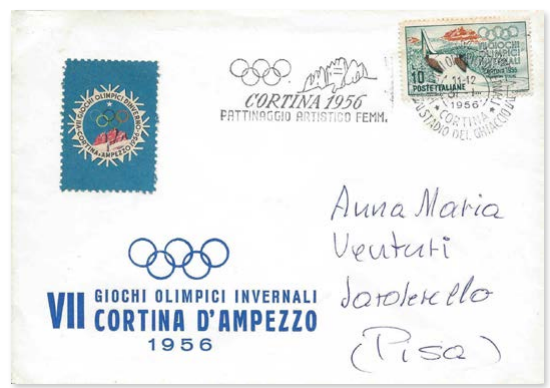 Fig. 12 : Lettre du 31 janvier avec l’oblitération mécanique relative au patinage artistique féminin où Tenley Albright (USA) obtiendra sa médaille d’or.
