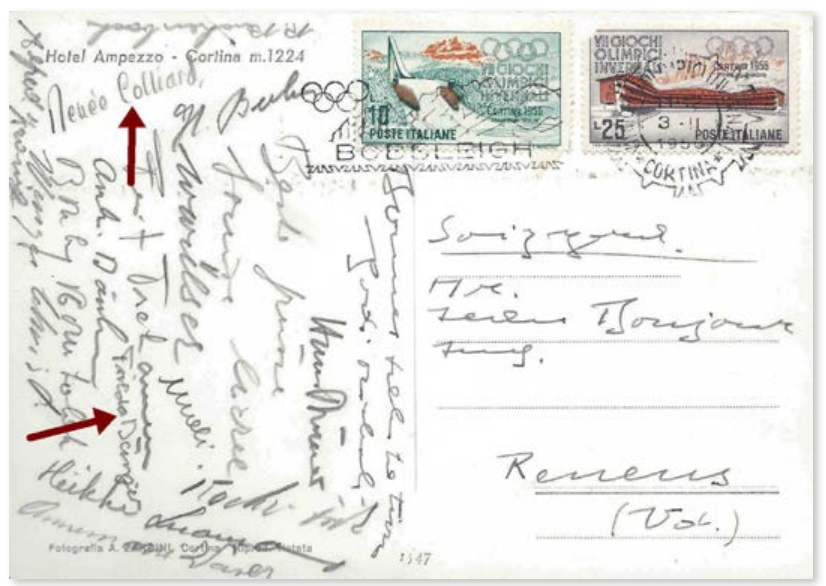Fig. 13 : Carte envoyée par les athlètes suisses le 3 février, jour de compétition de bobsleigh. Signatures de Renée Colliard, médaille d’or au slalom et Frieda Dänzer, médaille d’argent en descente. Un document postal avec des signatures originales agrémente avantageusement une collection.