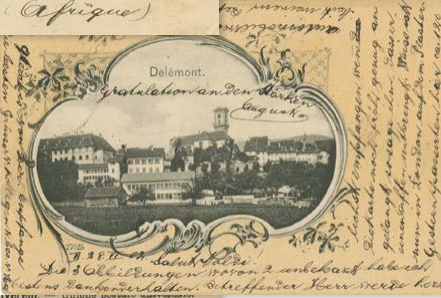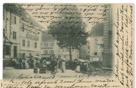 Voici mes deux trouvailles lors d’une bourse. Les deux cartes illustrées montrent Delémont : la première carte postale illustre une scène animée du marché en vieille ville (Place de la Liberté - fig. 1). La carte est envoyée de Delémont, comme l’indique le cachet de Delémont Transit (Güller 10387), le 18.08.1901 à destination de Freetown, la capitale de Sierra Leone en Afrique de l’Ouest.