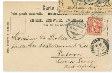 Vu l’écriture, il s’agit de la même personne qui écrit. Une fois il ou elle écrit « Kohler » et sur la deuxième carte on trouve l’orthographe « Koller ». En soi, les deux cartes postales illustrées sont « banales » si on ne tient pas en compte de la destination : Freetown (la capitale de Sierra Leone) en Afrique de l’Ouest. En consultant le livre de Richard Schäfer « Der Briefpostverkehr SchweizAusland 1459 1907 » on constate que le degré de rareté est de 11 points sur 12, donc une destination peu fréquente.