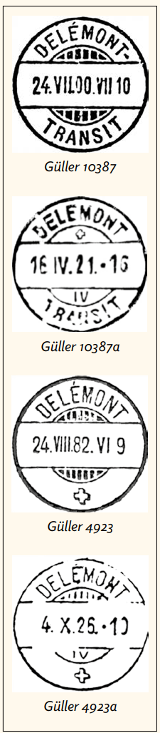 On pourrait aussi croire que le cachet de Delémont avait changé en une année, ce qui n’est pas le cas car le cachet Güller 10387 était utilisé à Delémont 1 et le cachet Güller 4923 à Delémont 2. Si on s’intéresse à la marcophilie on peut constater