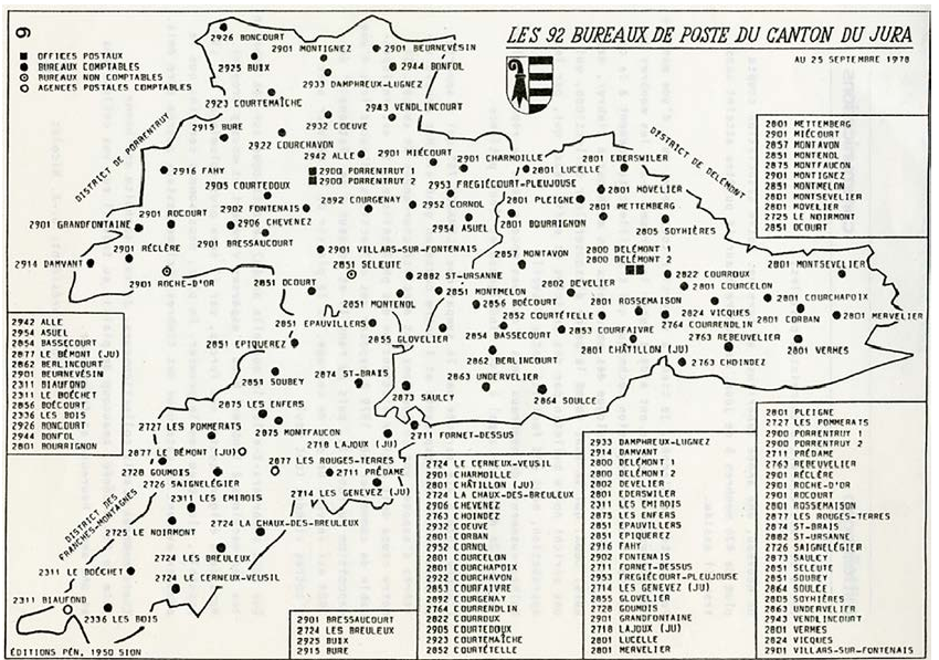 Fig. 4 : Bureaux de postes du Jura en 1978. Die 92 Postämter im Jura im Jahr 1978.