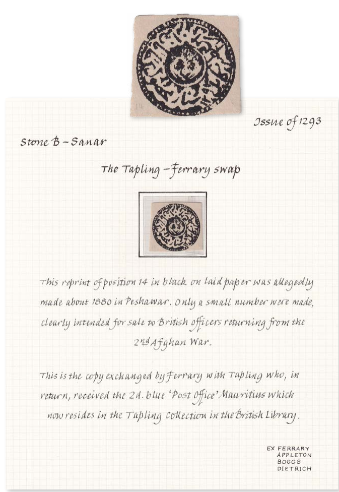Afghanistan 1876|1877 (Datum 1293) – Die berühmte Ferrary– Tapling-«Tausch»-Marke, bei der Tapling dieses Stück gegen die Mauritius Post Office 2d blau eintauschte (heute im British Library-Bestand). Der Reprint aus Peshawar 1880 war wohl zur Veräusserung an britische Offiziere des 2. Anglo-Afghanischen Krieges hergestellt worden. Nur zwei bis drei Exemplare sind bekannt, extrem selten.