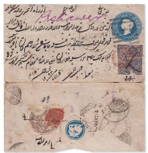 Afghanistan 1876|1877 (Datum 1293) – Incoming Mail. Mischfrankatur auf indischem ½-Anna-Ganzsachenumschlag von Kaschmir nach Kabul, zusammen mit Kaschmir 1867 ½ Anna Ultramarin (ungezähnt). Einer von weniger als zehn bekannten «Dreifach-Kombinationsbriefen», seltenste kombinierte Frankatur mit korrekter Taxierung für alle drei Postverwaltungen und aussergewöhnlich seltene Verwendung der afghanischen Ausgabe auf Brief.