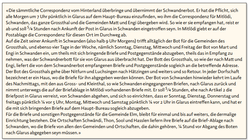 «Die sämmtliche Correspondenz vom Hinterland überbringe und übernimmt der Schwandnerbot. Er hat die Pflicht, sich alle Morgen um 7 Uhr pünktlich in Glarus auf dem Haupt-Bureau einzufinden, wo ihm die Correspondenz für Mitlödi, Schwanden, das ganze Grossthal und die Gemeinden Matt und Engi übergeben wird. So wie er sie empfangen hat, reist er ab und soll 5 ⁄4 Stunden nach Ankunft der Post in Glarus in Schwanden eingetroffen seyn. In Mitlödi giebt er auf der Postablage die Correspondenz für diesen Ort im Durchweg ab.