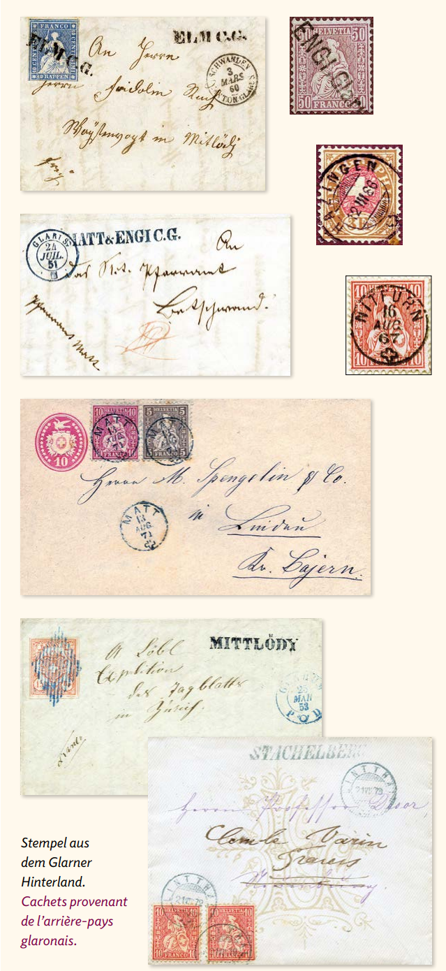 An Formen und Farben der Poststempel ist das Glarnerland ungewöhnlich reich. Seit der Helvetik bis 1835 besass lediglich das Hauptbüro in Glarus einen Stempel; er war nach französischem Muster geformt und gab auch Monat und Tageszeit französisch an. Im Hinterland finden wir die frühesten Poststempel 1842 in Schwanden und Diesbach, gefolgt 1843 von Mitlödi und 1844 von Matt, immerhin auch schon 1846 von Elm und erstaunlicherweise erst 1853 von Linthal.