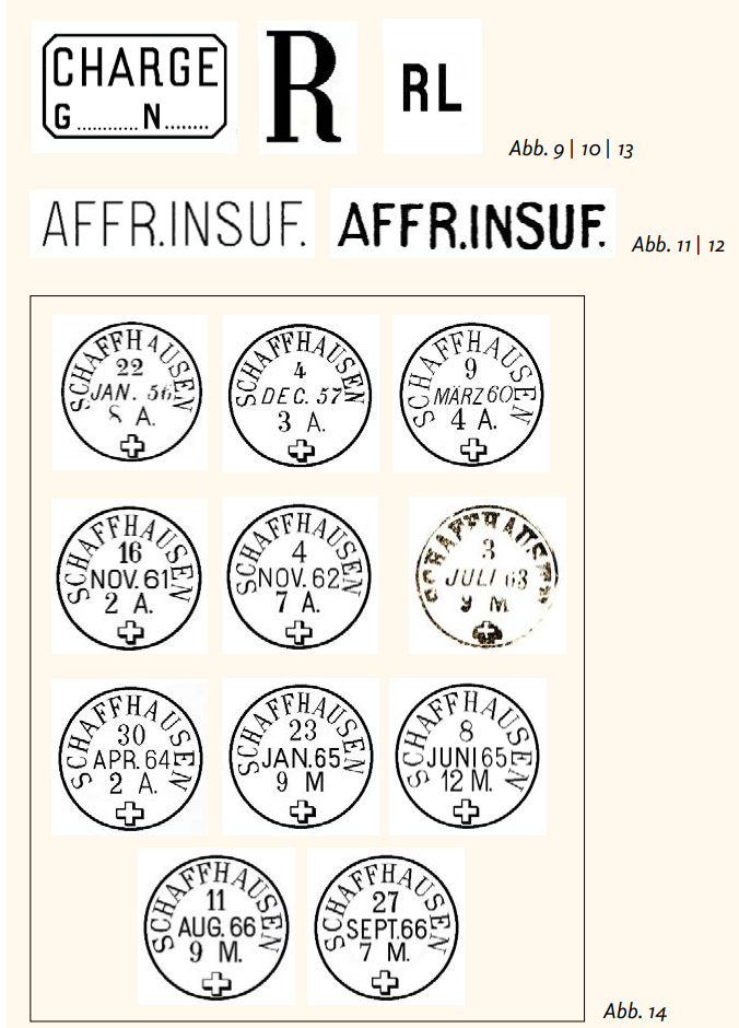 Dazu wird der AFFR.INSUF. verwendet (AW 16 - Abb. 11|12). Spätestens ab 1878 wurden Nachportomarken für die fehlende oder ungenügende Frankatur auf die Briefe aufgeklebt. Schaffhausen hatte mindestens zwei unterschiedliche Stempel im Einsatz.