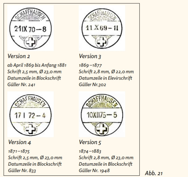 Ab ca. 25. April 1869 folgte in Schaffhausen der leicht geänderte Nachfolger des Teststempels 66 (Abb. 21). Bis mindestens Februar 1883 kamen insgesamt fünf Stempel AW 147B zum Einsatz. Die Version 2 wurde trotz vieler Liniendefekte an der Datumbrücke noch jahrelang benutzt, zuletzt jedoch vorwiegend auf Nachnahmen und Fahrpostbelegen.
