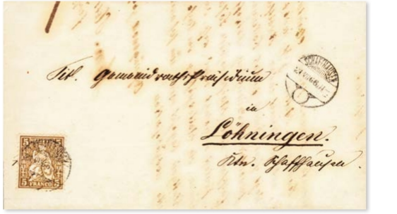 Wie auch immer, bis Ende August 1855 benutzte Schaffhausen einen kleinen Fingerhutstempel der Gruppe AW 1041 (Abb. 1). Der alte Verspätungsstempel der T&T-Post nahm auf den Briefen zu viel Platz weg. Ein neuer «Nachmittag» musste angeschafft werden. Dieser ist in der Gruppe AW 77 aufgeführt und bisher nachgewiesen ab 24. April 1851 bis Ende August 1855 (Abb. 2).