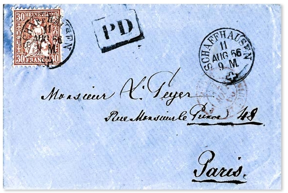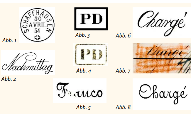 Das PD im Oval der T&T-Post wurde ca. 1853 bis 1855 abgelöst und durch ein markantes PD mit dickem Rahmen ersetzt (AW 13B —- Abb. 3). Im Laufe der Jahre wurden die Rahmenlinien mehr und mehr defekt, der Stempel scheint durch Abnützung der Aussenränder kleiner zu werden (Abb. 4). Die Buchstaben und das (innere) Rahmenmass sindjedoch in der gleichen Anordnung und Grösse. Weil in unserem Hobby oft von Francobriefen gesprochen wird, darf auch dieser Stempel nicht fehlen (Abb. 5). Im Unterschied zu den damals häufigen Portobriefen «mit fälliger Taxe beim Empfänger» hat man bei vorausbezahlter Taxe meist handschriftlich «frei», «franco», «fco» auf den Briefumschlag geschrieben. Nur wenige Briefe sind bekannt mit dem Stempel «Franco», der offensichtlich nicht am Normalschalter zum Einsatz kam. Er kommt vor auf Wertbrief und eingeschriebenem Brief. Bei eingeschriebenen, registrierten Briefen wurde auf der Briefvorderseite ein Charge&-Stempel (AW 19AS, Nr. 11 — Abb. 6) aufgebracht. Er ist kleiner als der bisherige aus der Postmeisterzeit. Oft wurde auch noch ein Rötelgitter oder sog. NB = Nota Bene auf dem Briefumschlag verewigt (Abb. 7). Erst vor Kurzem wurde ein R-Brief Beringen - Schaffhausen mit einem Charge AW 19Bı (sog. Kastenstempel) angeboten. Weil der Brief infolge Ableben des Adressaten zurückgeschickt wurde, kam für die Rücksendung ein zweites Charge (AW 19AS, Nr. 4 - Abb. 8) mit neuer Manualnummer auf den Brief. Weil die Rücksendung in einem rückwärtigen Büro bearbeitet wurde, kam nicht das normale «Schaltercharge» darauf, sondern dieser feine Stempel, welcher in ganz ähnlicher Form auch in Winterthur und allgemein im Postkreis VIIl (dort aber in Blau) im Einsatz war. Dieser feine Charg& von der Schaffhauser Post lag bisher erst zweimal vor.