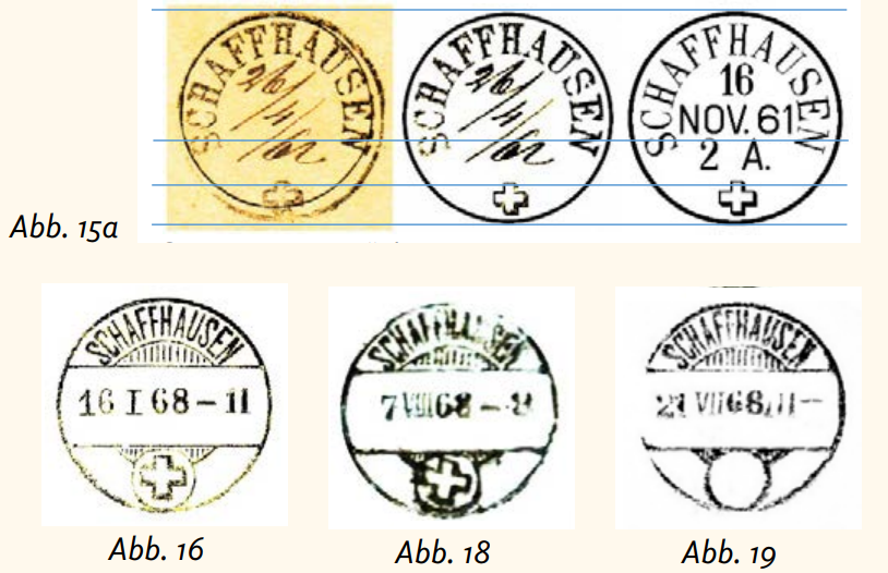 Ab September 1855 kommt der erste Ortsstempel der Stempelserie AW 115, mit Datum und Tageszeit zum Einsatz (Abb. 14). Die Zahlen des Datumeinsatzes und der Tageszeit werden nach wie vor zusammengefügt, eingesteckt und befestigt. Bedingt durch das höhere Postaufkommen leidet oft die Stempelqualität, wirklich saubere Abschläge sind nicht häufig. Die Stempel müssen relativ oft ersetzt werden. Im Laufe der nächsten 13 Jahre sind immerhin elf unterschiedliche Stempel dieses Typs im Einsatz, zuerst mit kursiver, dann mit senkrechter Datumzeile. Der Ortsname SCHAFFHAUSEN und der Tag sind immer in Elzevirschrift, der Monat durchwegs in Blockschrift, die Jahreszahl wechselt zwischen Elzevir und Blockschrift (Grotesque). Die letzten Stempel dieser Serie wurden zum Teil gleichzeitig eingesetzt, sie lagen wahrscheinlich an zwei Postschaltern auf. Sie unterscheiden sich nur noch leicht in den Buchstaben ....FHAUS.... Die letzte Anwendung des AW 115 ist bisher vom Mai 1868 nachgewiesen.