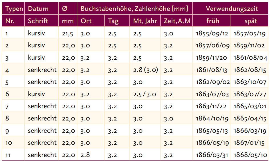 Stempel mit fehlender Jahreszahl sind keine neuen Stempel, sondern defekte oder verlorene Einsätze der bestehenden Stempel. Die ersetzte Jahreszahl 61 beim Typ 3 ist gar senkrecht und gross wie beim Typ 4, der Monat jedoch nach wie vor in kursiver Schrift, beim Typ 4 erst schmal, dann breit, dann schmal. Schief stehende oder auch kopfstehende Datumzeilen kommen vor. Bedenkt man, dass die Einsätze stündlich resp. täglich resp. monatlich gewechselt und neu montiert werden mussten, sind auch schief stehende und kopfstehende Datumzeilen verzeihbar.